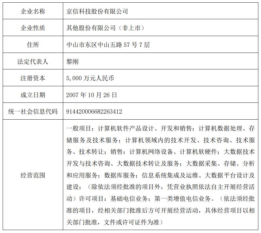 据介绍,本次交易的标的公司为京信科技股份有限公司(以下简称“京信科技”),成立于2007年,位于中山市东区中山五路57号7层,注册资本5000万元,法定代表人黎刚,经营范围包括计算机软件产品设计、开发和销售;计算机数据处理、存储服务及技术服务;计算机领域内的技术开发、技术咨询、技术服务、技术转让,等等。