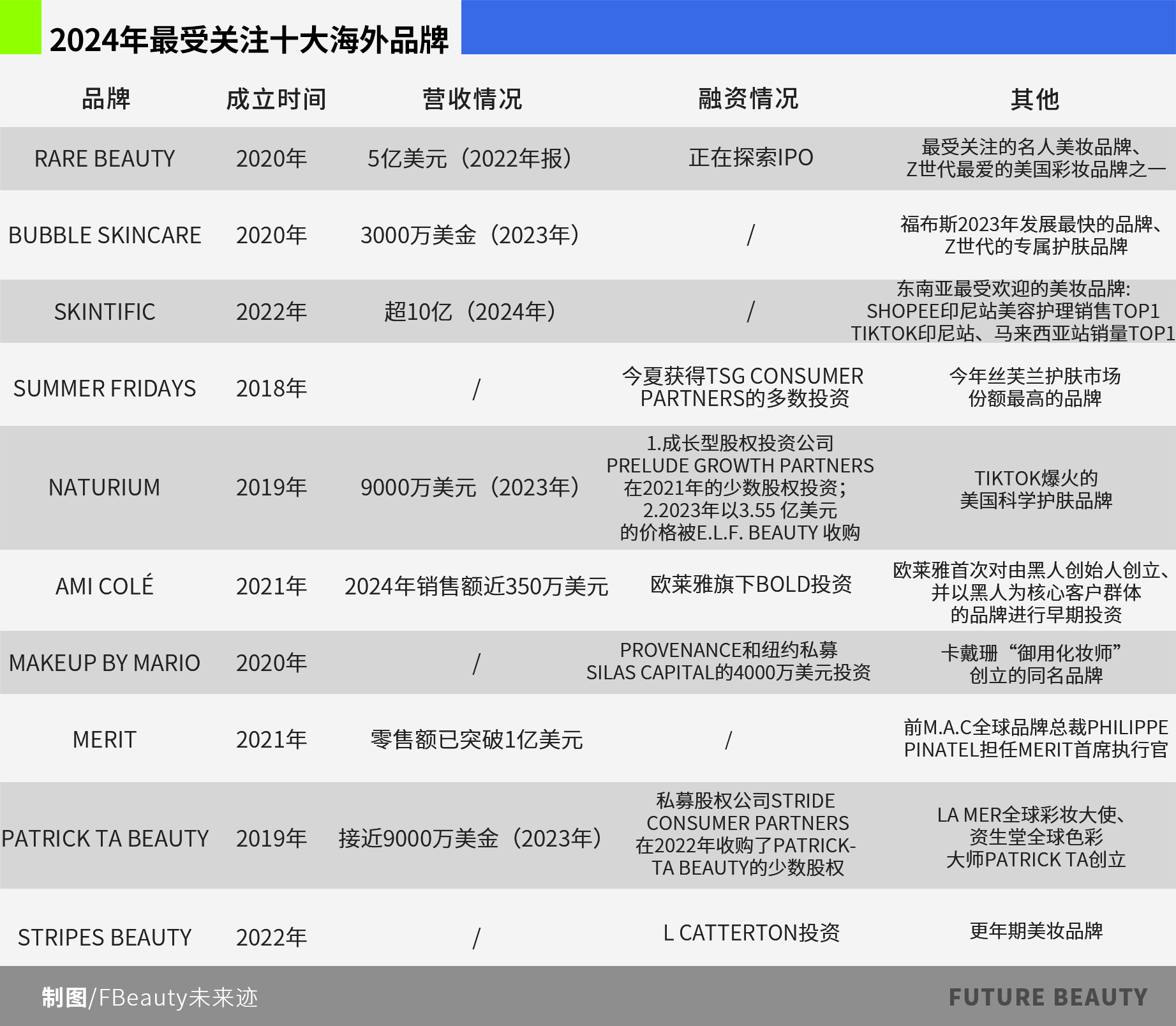 按照“成立时间在2018年及以后,获得过投资机构/美妆大厂投资,单平台销量TOP1品牌/体量在8000万美元(5.8亿元人民币)”这几个条件,《FBeauty未来迹》筛选出了目前海外市场最受关注的十大美妆品牌。