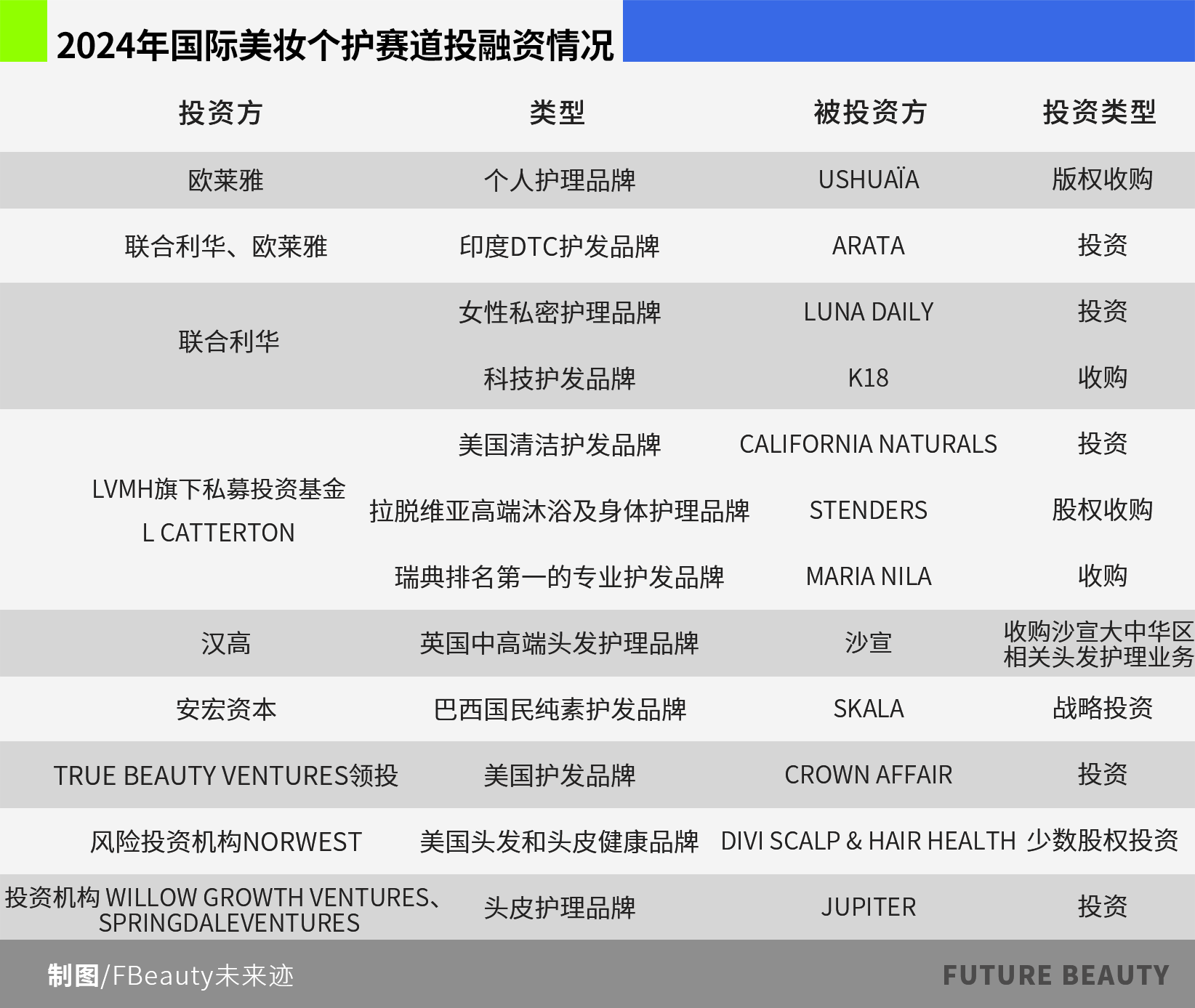 个护赛道无疑是2024年“最热门”的投资方向。共有9个品牌被私募基金和国际美妆集团投资或收购。欧莱雅、联合利华、LVMH集团、汉高集团等纷纷布局身体护理和头皮护理洗护市场。