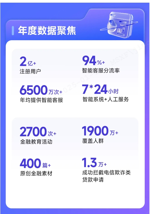 马上消费构建起事前、事中、事后的全链路防范电信网络诈骗防御体系,基于多维大数据,实现高并发下的实时计算,快速稳定实现毫秒级欺诈风险决策,通过界面化、图形化快速实现策略及模型部署,第一时间感知风险态势、及时预警,保护消费者资产和信息安全。2024年,该公司成功拦截电信欺诈类贷款申请1.3万余起。