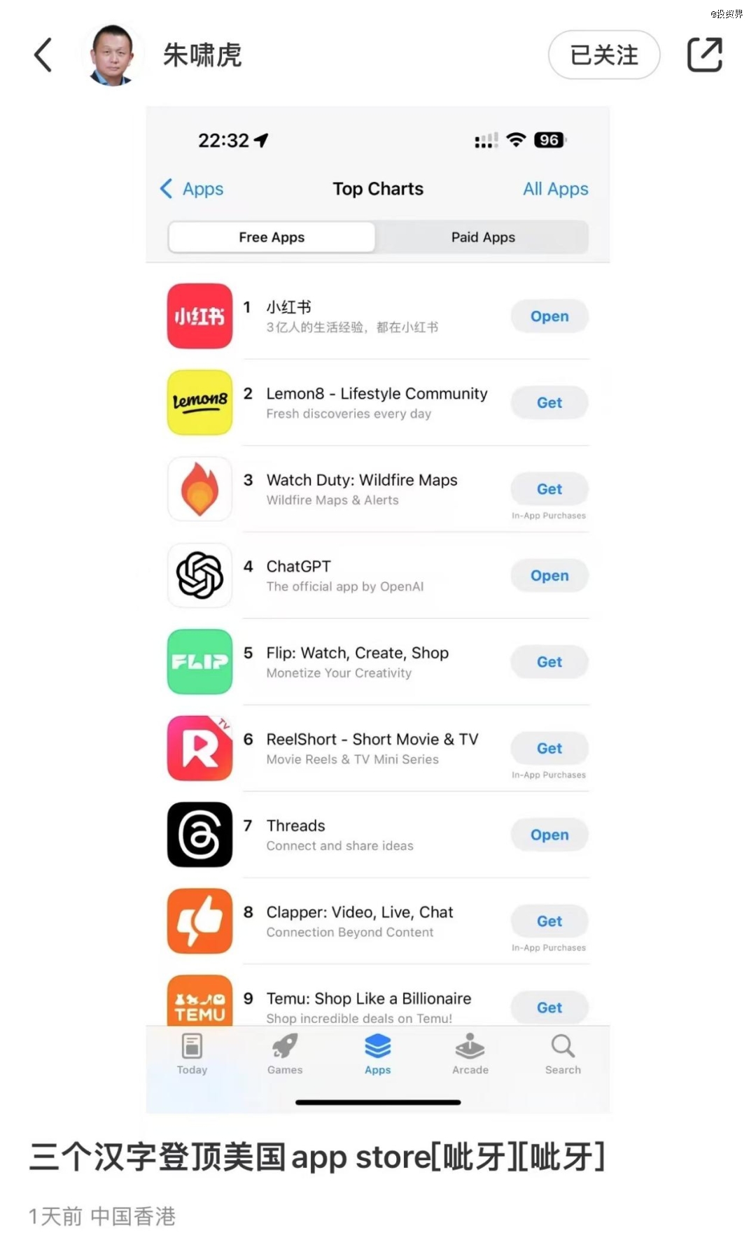 目睹这一幕,小红书投资人朱啸虎在个人小红书帐号上发文:“三个汉字登顶美国app store”,并附以“呲牙笑”的emoji。喜悦之情溢于言表。