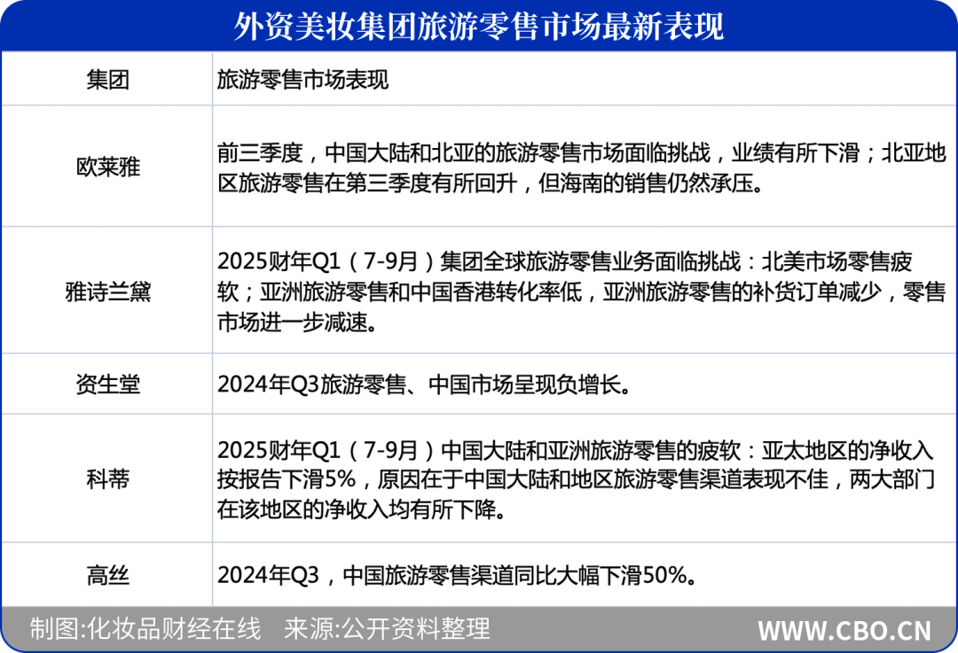 2024年第三季度,高丝集团在中国市场旅游零售渠道同比大幅下滑50%。高丝集团方面直言:“中国大陆和中国旅游零售板块的销售额大幅下降、消费者支出仍然疲软、市场库存仍然停滞不前。”