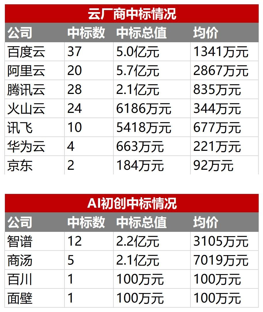 但细究下来,腾讯云共计中标28个,金额总计2.1亿元;阿里云中标20个,共计中标5.7亿元;百度云中标37个,共计拿下5亿元的单子;火山云中标24个,但总金额只有6186万元。