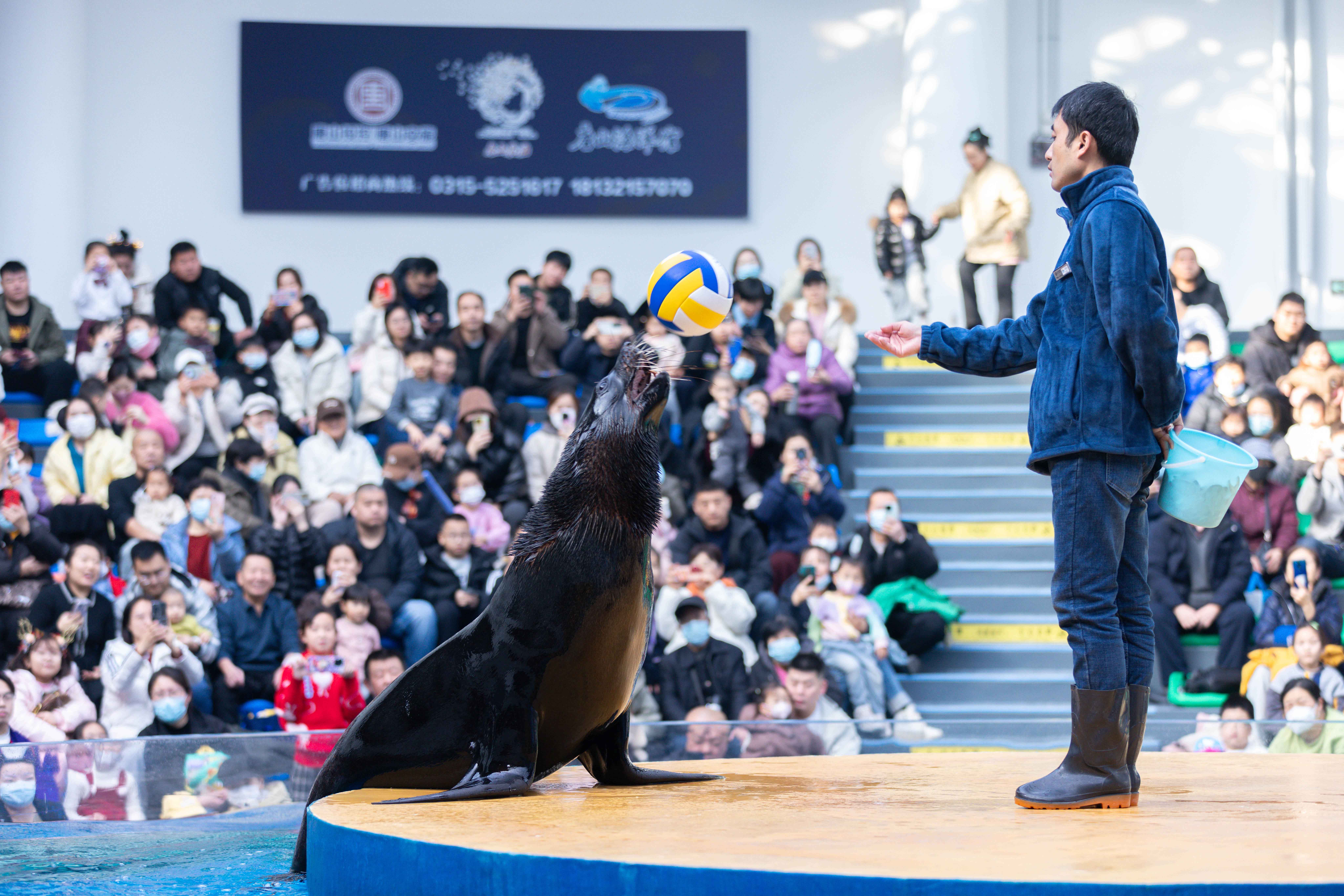 抚触海底展区内,小丑鱼、狮子鱼、牛角箱鲀等各种色彩艳丽的小鱼在灯光的映衬下闪烁着光芒,让人仿佛置身于神秘的水下世界。鲨鱼隧道里,游客可近距离观察黑鳍鲨、白鳍鲨等海洋捕食者,观看惊险刺激的人鲨共舞演出。深海遨游展区内,近1500尾金黄色的黄鹂无齿鲹环绕在潜水员身旁,形成由深海鱼类组成的巨型黄金旋涡,为现场观众带来无与伦比的视觉盛宴。展区内的东星斑、蓝点石斑、海鳝、吸盘鲨、东方胡椒鲷等各色鱼类也让游客大饱眼福。珊瑚秘境区域则重点展示了30余种、近500只色彩绚烂的珊瑚及各种共生生物。游客们亲手触摸着海星、绿海龟、寄居蟹等海洋生物,感受着来自海洋世界的生机与活力。