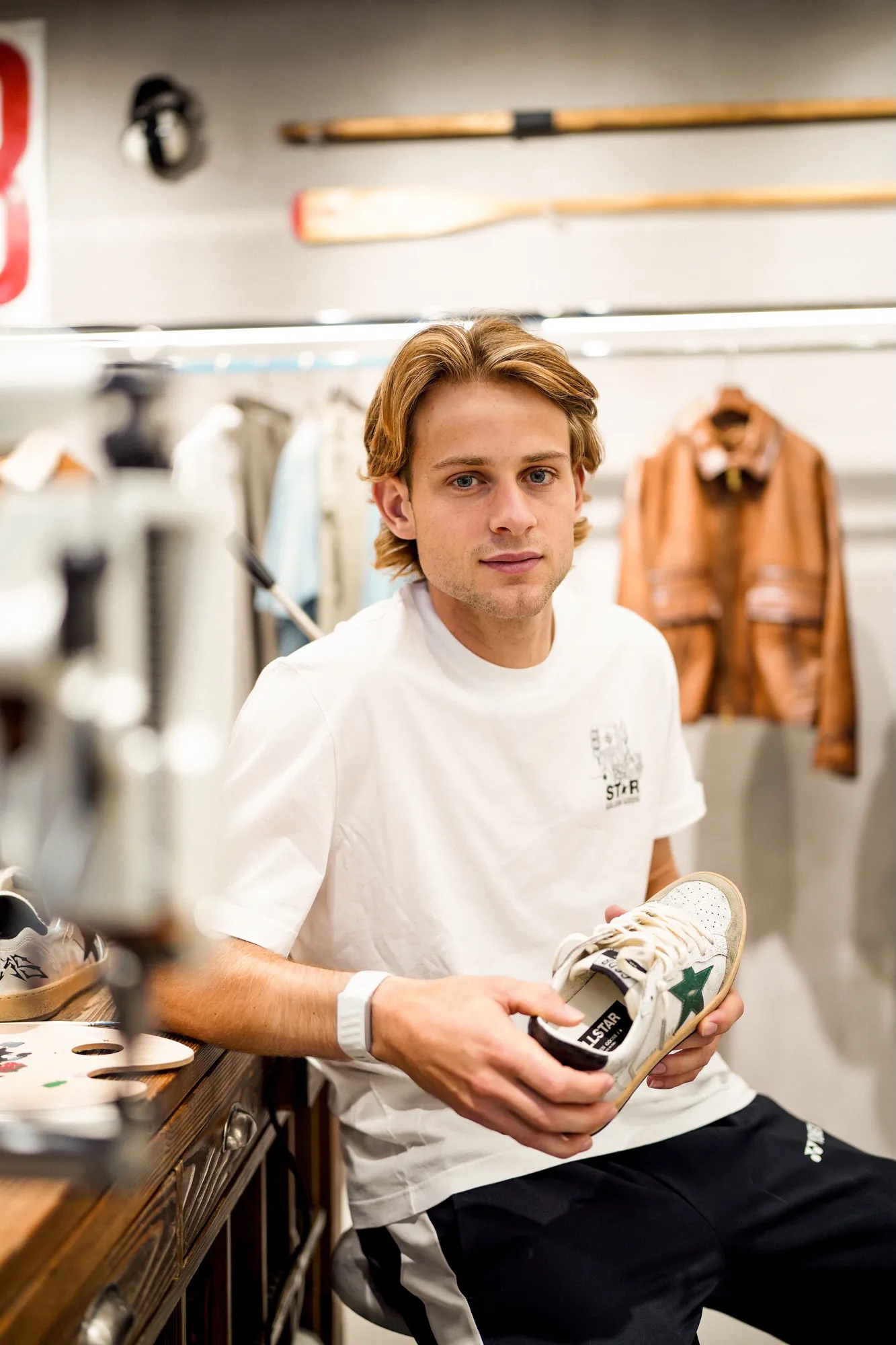 Golden Goose同期还推出了一个全新的产品线STAR系列,由该品牌与意大利板式网球运动员共同创作。该系列包括成衣、板鞋以及板式网球拍产品。