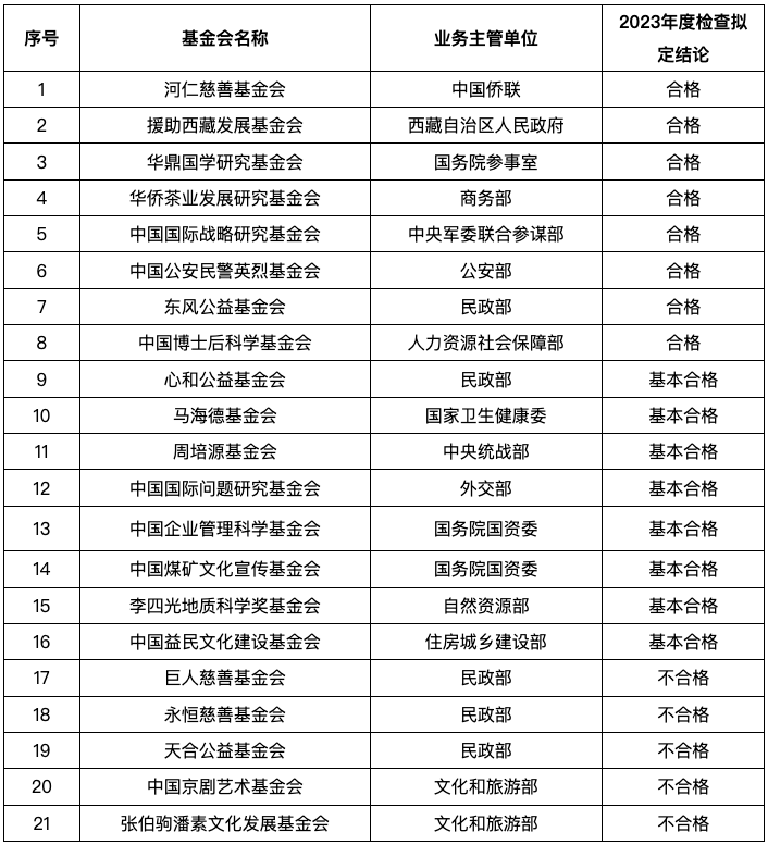 民政部1月17日公告:根据《基金会管理条例》、《基金会年度检查办法》等规定,民政部门对未认定为慈善组织的基金会实施年度检查并出具年检结论。现将民政部登记的未认定为慈善组织的21家基金会2023年度检查拟定结论予以公示。如对公示的拟定年度检查结论有异议,可在公示期间以书面形式向民政部慈善事业促进司反映。公示时间:2025年1月17日至1月21日。