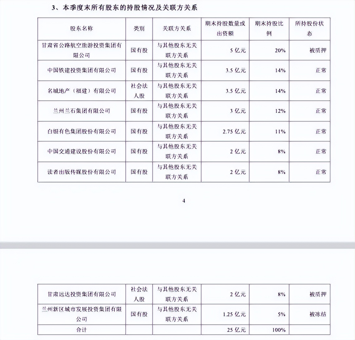 此外,甘肃远达投资集团有限公司所持黄河财险全部股权已被质押,持股比例为8%,为黄河财险第八大股东;黄河财险第九大股东兰州新区城市发展投资集团有限公司所持5%股权则被冻结。