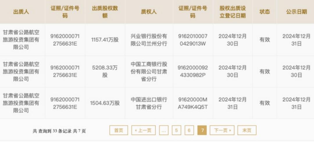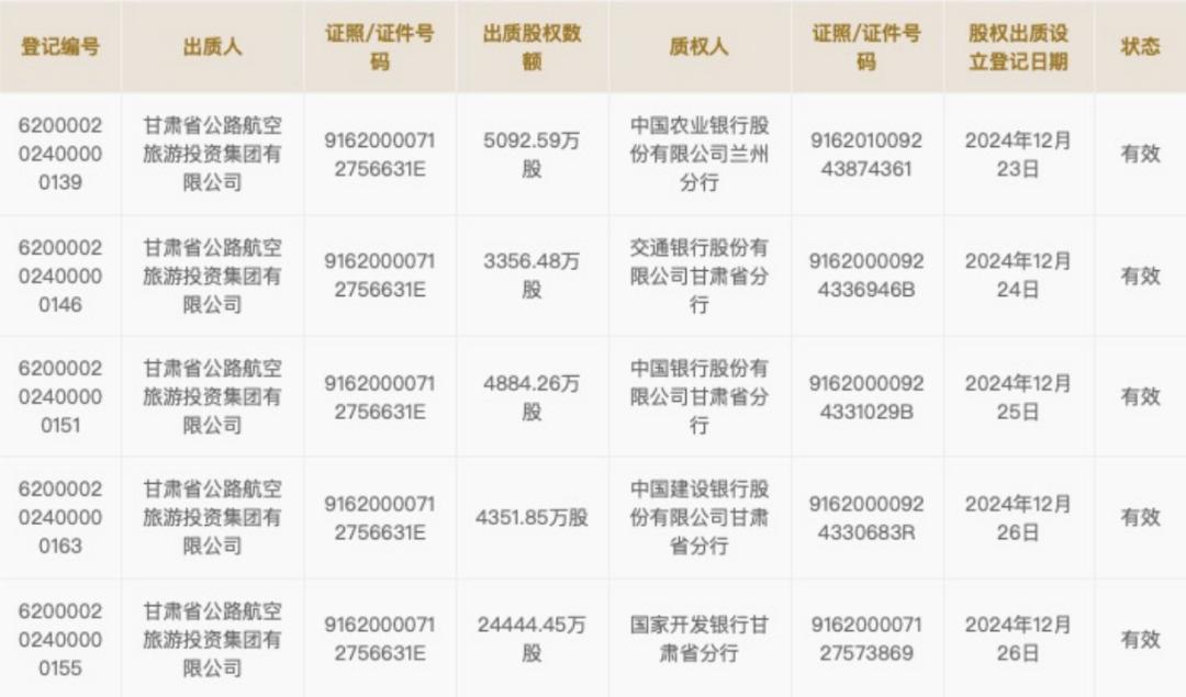 国家企业信用信息公示系统披露,2024年内,黄河财险遭公路航旅出质股权达29次,目前仍有8则为有效质押,累计质押5亿股,也就是说,公路航旅所持全部黄河财险股权已被质押。