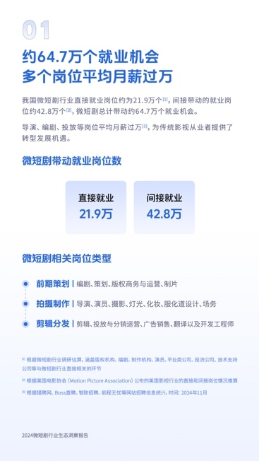 报告对招聘网站的数据分析发现,2024年11月,经去重后的在招岗位共计9000个。2024年各大平台上线微短剧3万多部,横店、西安、郑州等地的微短剧制作方全年不间断开机,承接大量从传统影视转型的从业者以及艺术院校毕业生就业。