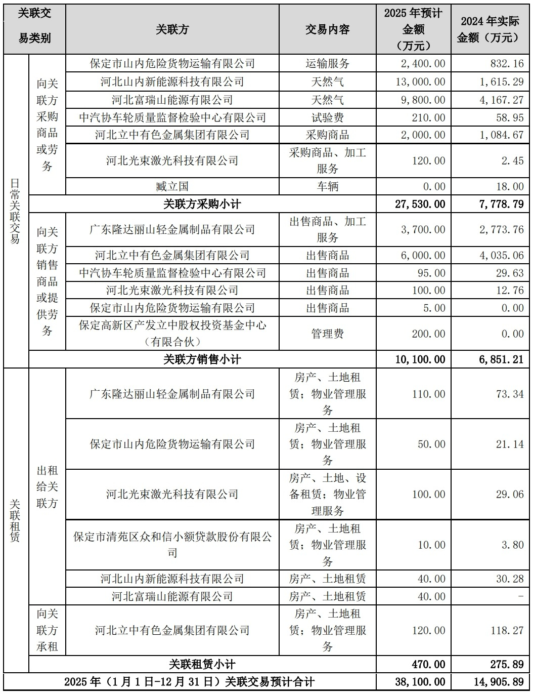 据公告显示,因日常生产经营需要,公司与广东隆达丽山轻金属制品有限公司、河北立中有色金属集团有限公司、中汽协车轮质量监督检验中心有限公司、保定市山内危险货物运输有限公司、河北山内新能源科技有限公司、保定市清苑区众和信小额贷款股份有限公司、河北 光束激光科技有限公司、保定高新区产发立中股权投资基金中心(有限合伙)、河北富瑞山能源有限公司等发生交易事项。前述公司为公司关联方,上述交易事项构成关联交易。