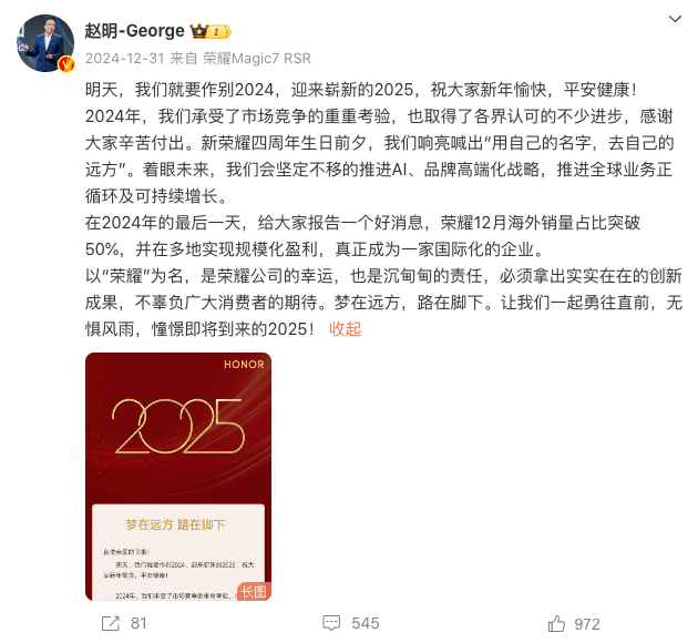 2024年末,赵明在管理团队新年致辞中透露,当年12月,荣耀的海外销量占比突破50%,并在多地实现规模化盈利,真正成为了一家国际化企业。