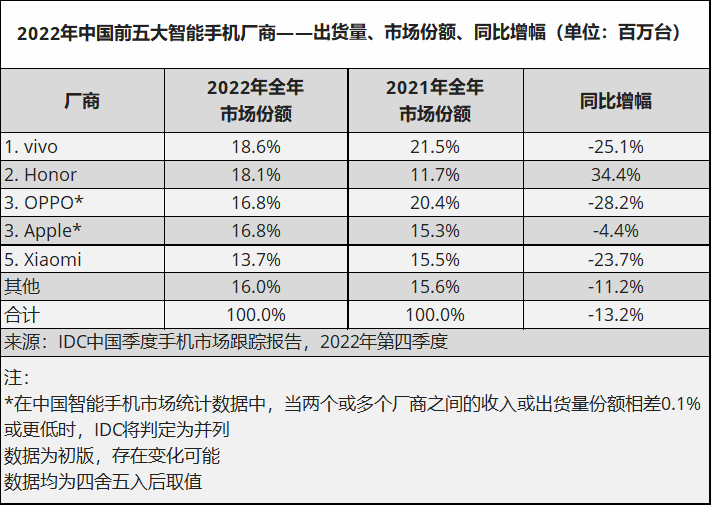 好在,在赵明的带领下,荣耀深耕华为“平替”的战略优势,不断推出与华为手机特质相仿的高端手机产品,一举涅槃重生。IDC数据显示,2022年,荣耀手机出货量同比激增34.4%,占据18.1%的市场份额,位列第二。
