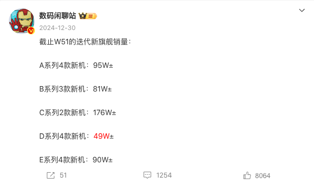 然而,荣耀Magic7系列手机并未斩获亮眼的销量。2024年末,数码博主“数码闲聊站”爆料称,截至第51周(12.16-12.20),荣耀Magic 7系列手机销量仅为49万左右。对比而言,与荣耀Magic 7同期发布的小米15系列销量为176万,是前者的3.6倍。