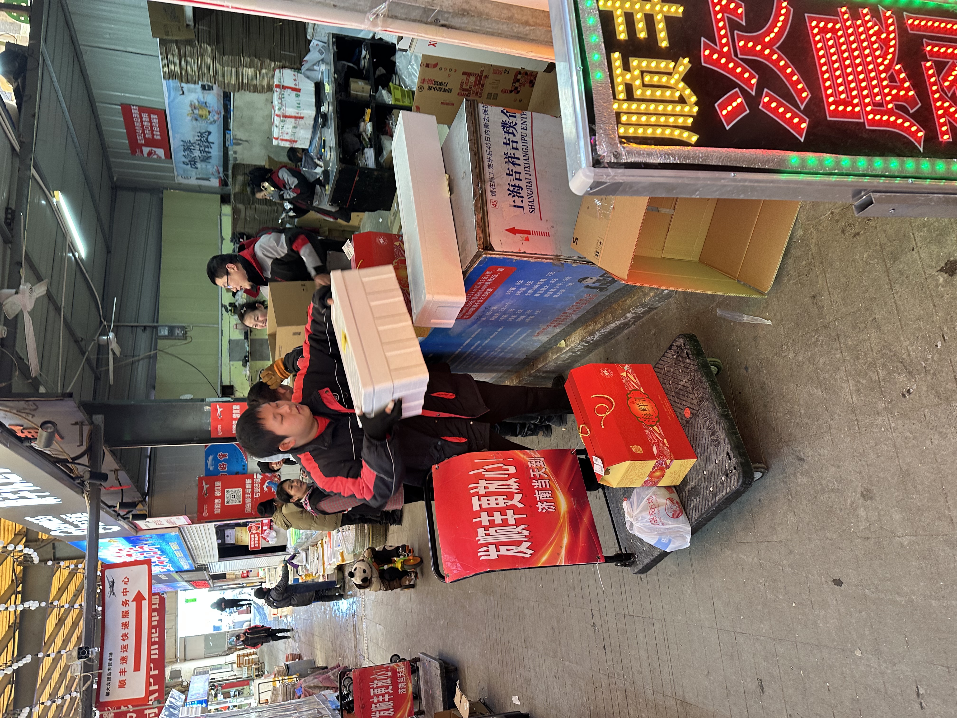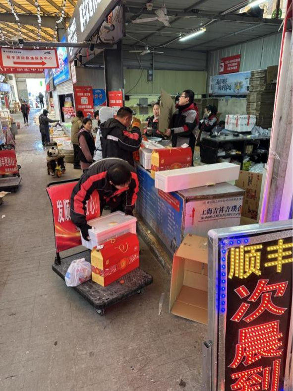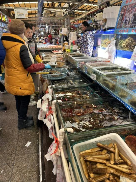 刚一走进团岛农贸市场,记者就被扑面而来的热闹气氛所吸引。在海鲜售卖区,购物人潮涌动。各个摊位上摆满了鱼虾蟹贝类等,备货充足,新鲜诱人,吸引不少市民游客驻足采购。“海蛎子、鲅鱼、刀鱼、大虾、墨鱼、比管鱼等等卖得都不错。除此之外,帝王蟹、龙虾等高档海鲜食材也颇受欢迎。”多位摊贩向记者介绍。据了解,海鲜是青岛颇负盛名的特产,不少顾客选择购买后打包发往全国,让家人朋友能品尝“青岛味道”。为此,团岛市场还专门设有冷链发货服务,方便消费者将购买的海鲜发往外地。记者在现场看到,顺丰、京东等快递点一片忙碌,发货人员正忙着将海鲜、干货等打包发往外地。市民刘先生对记者说,亲戚住在淄博,每年都会买点海鲜寄给他们。“基本上年底都会来团岛市场这里买,新鲜又方便。”