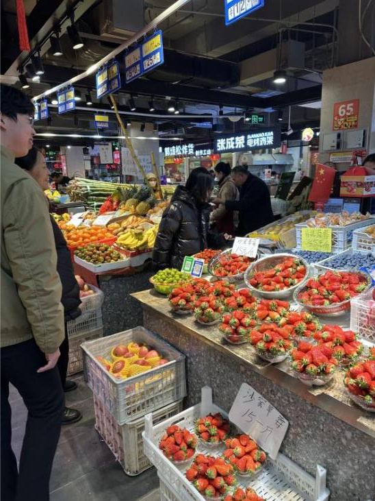 除了海鲜肉类,高档水果礼盒销量也不断攀升。据一位水果摊主介绍,最近一段时间,车厘子、晴王、草莓、柑橘类水果礼盒销售走高。“来买水果备年货的客户非常多,尤其是车厘子、草莓等,卖得尤其好。”记者看到,不少居民都是几盒、几框地置办年货,出手颇为“豪爽”。“年底正是吃车厘子、草莓的时候,今年价格也非常合适,多买点回去尝尝。”正在挑选车厘子礼盒的赵阿姨说。