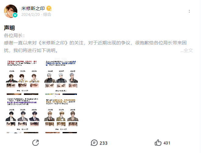 但也正在“守得云开见月明”的时刻,《米修斯》左脚刚迈进2024年,右脚便因发布的两张新年贺图卡面,陷入了“女主党”、“抄袭”的风波。