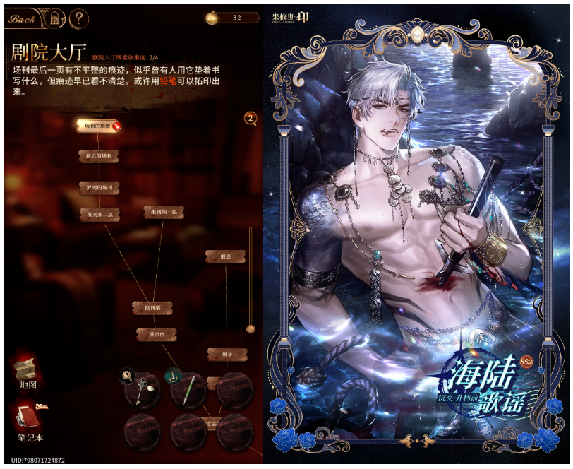比如活动玩法“格洛瑞斯绝唱”就让冰棍在内的不少玩家惊喜。它采用了当下乙游戏少见的“恐怖向”剧本杀玩法形式,让玩家用“文字模拟”的方式探索剧院,收集磁带、实验记录等物品,一步步揭开拉瑞斯集团研究的内幕和当晚无人生还的惨案。甚至主线之谜——物管局长之死——也串联其中,荡气回肠又细思极恐。(假装没被吓到)