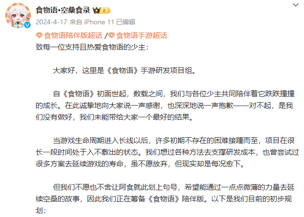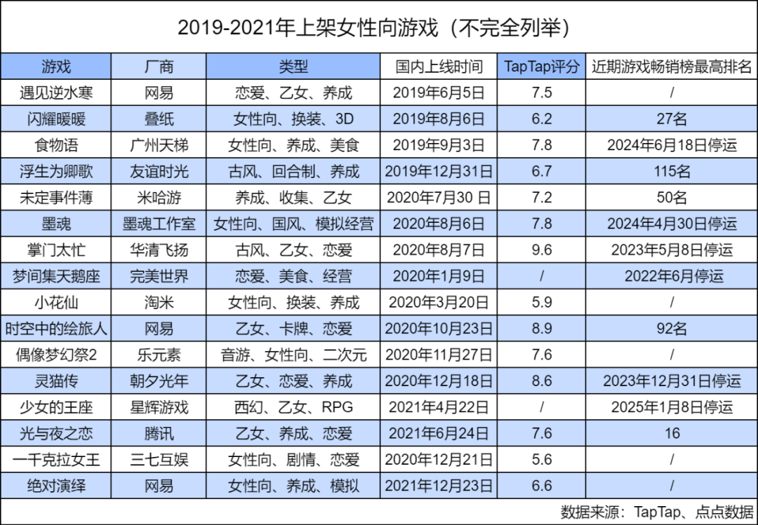 但相较光鲜一面,在2024年,更多女性向游戏因入不敷出宣布停服,包括但不限于《摇光录:乱世公主》《少女的王座》《筑梦公馆》《食物语》等。个中难题,除产品生命周期的自然衰落,也不乏经济紧张、玩家审美疲劳带来的消费欲望下降。僧多肉少,无论标注何种标签,新游的突围难度都大幅加强。