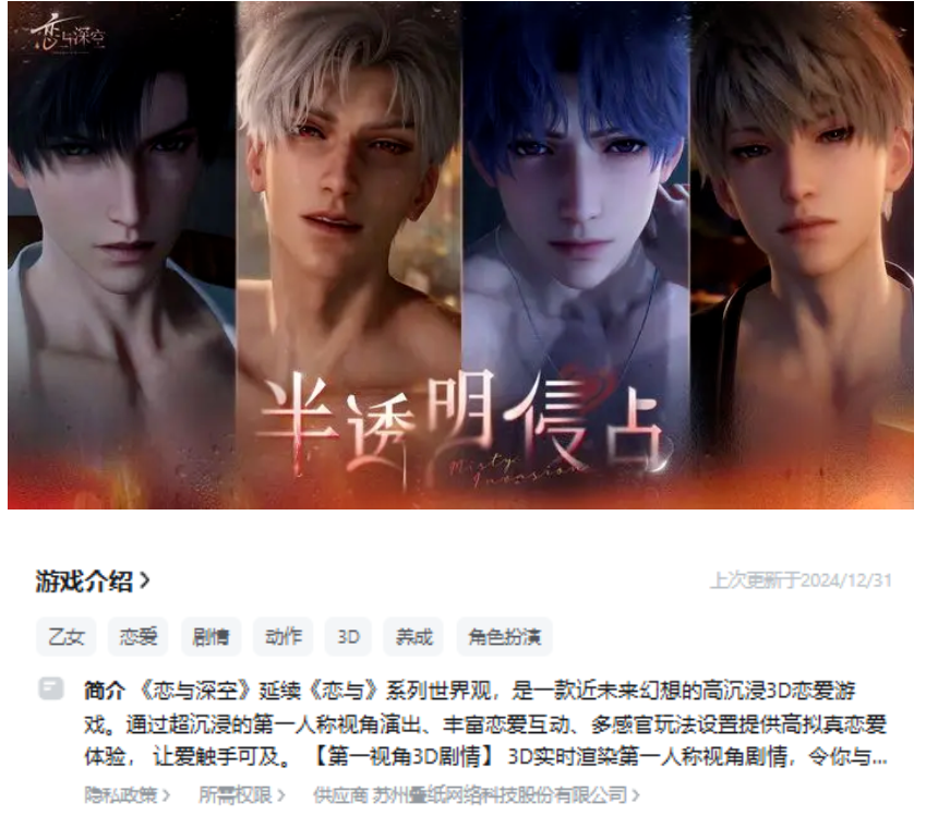 其中,2024年,《恋与深空》《世界之外》便高举“乙女恋爱”标签强势回归。其中,《恋与深空》的第一人称3D视角、主角捏脸系统,高沉浸恋爱体验直接消弭“代入党”与 “女主党”之争,成为乙游的“集大成者”,更在2024年女性向游戏市场占比遥遥领先。