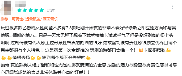 可以说,《米修斯》能够逆袭与玩家的“口耳相传”不无关系。玩家冰棍儿便由朋友推荐入坑。一边是朋友对“剧情”和“男主人设”的盛情夸赞,另一边是网络上“缝万家”的言论,她抱着一睹究竟的心态下载后,意外发现:“还不错”。