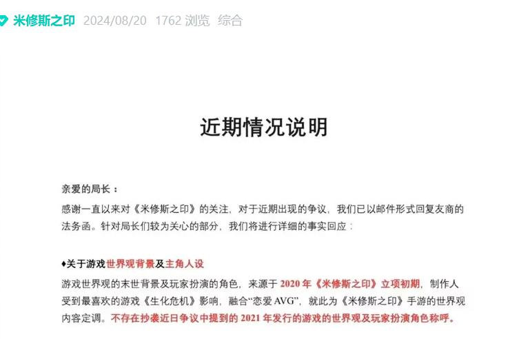 为安抚玩家,官方在2月及8月两次发布公告回应争议。包括但不限于:公布与投资人的聊天记录,显示女主背景在2020年已设定为物资管理局局长;回应玩家扮演角色无固定名字,发布超话公告,绘制新卡面;表示绝未使用AI;强调团队核心人员为女性,“辱女”无从谈起等。