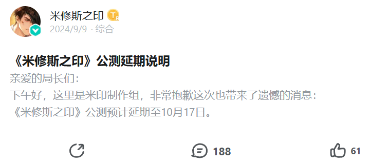 但面对争议易陷自证困境,更不论分身乏术的小团队。伴随争议,《米修斯》引起更多关注,在9月,官网预约数破百万。但同时,游戏评分持续下跌,直至9月8日,TapTap期待值仅5.9分。其后,又因公测前测试出现问题,《米修斯》的公测日期延期两次。