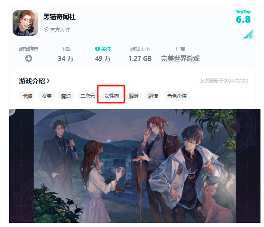 例如完美世界《黑猫奇闻社》便曾在测试期间删去“乙女”标签,化身“女性向”游戏。尽管游戏题材玩法在都市怪谈解谜上大做文章,但抱着乙游初印象的玩家进入游戏后,发现恋爱体验浅尝辄止,也导致游戏体验难以定性。上线一周后,在最高获得畅销榜第98名后,跌出榜单。