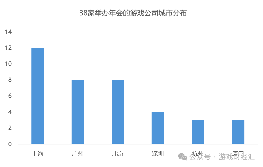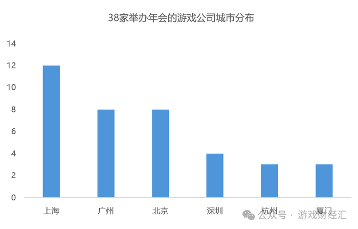 从地域分布来看,38 家举办年会的游戏公司主要集中在北上广,其中上海公司数量最多,包括米哈游、莉莉丝、B 站、沐瞳、叠纸、鹰角、心动、盛趣、Yostar、紫龙、波克城市、蛮啾等。