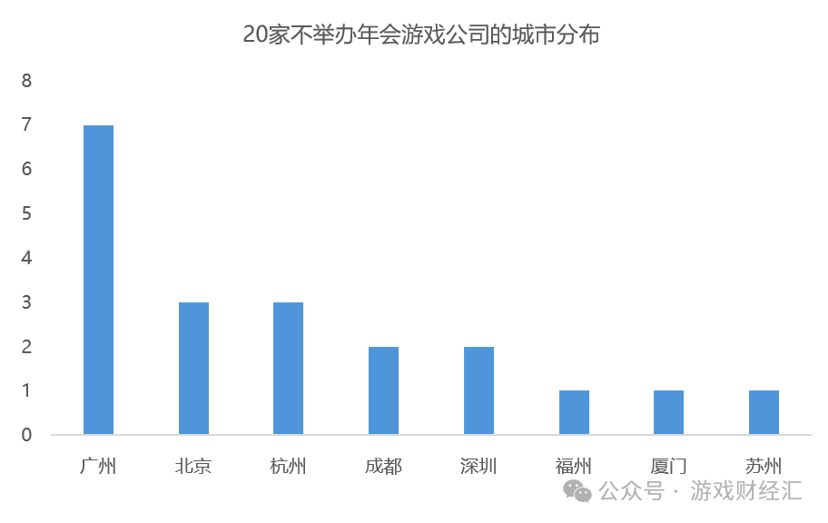 而20 家暂无年会安排的游戏公司主要集中在广州、北京和杭州,其中广州公司数量最多(毕竟,广州游戏公司数量本身也多,特别是中小企业)。