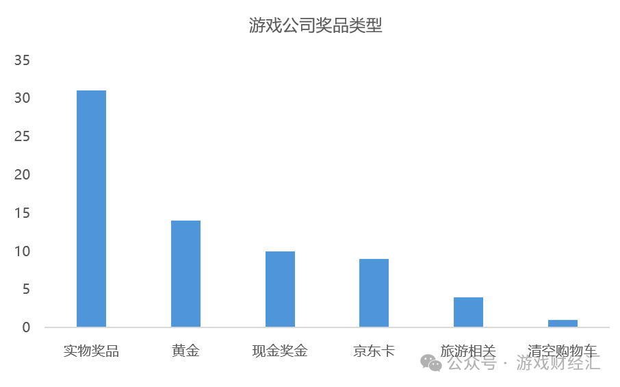 在上述游戏公司发放的前三等奖中,31 家公司选择发放实物奖品,14 家公司送黄金,10家公司发放现金奖金,9 家公司发放京东卡,4 家公司提供旅游相关奖品。值得一提的是,厦门延趣公司的特等奖为清空购物车2 万元。