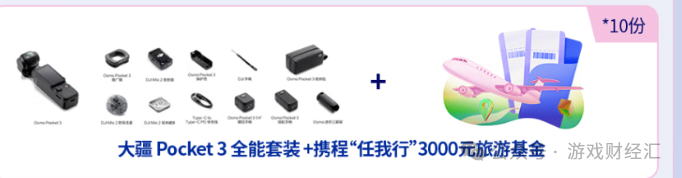B 站的二等奖包括10 份“大疆Pocket3 全能套装+ 携程‘任我行’3000 元旅游基金”。