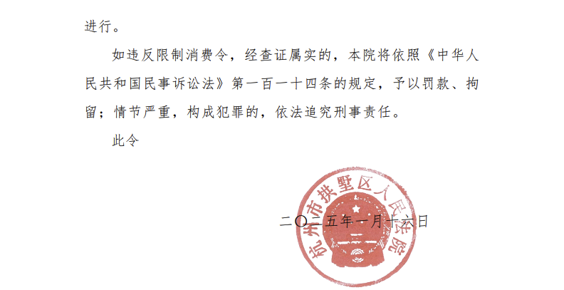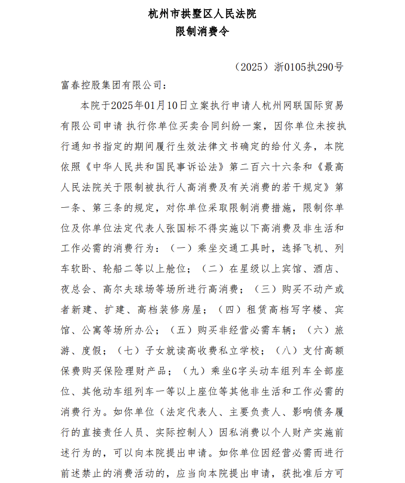 中国执行信息公开网显示,1月16日,富春控股集团有限公司及其法定代表人张国标新增限制消费令,涉及买卖合同纠纷案件,申请人为杭州网联国际贸易有限公司、执行法院为杭州市拱墅区人民法院。