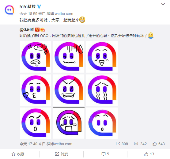 陌陌为了产品视频化也于2017年3月30日在其官方微博上低调表示换了品牌logo,并提出由单一的LBS社交平台到工具型应用基于视频的泛社交泛娱乐平台的转型。相较而言,更新后的logo与其他社交软件简单、直接的呈现相比更有层次感和多样性。