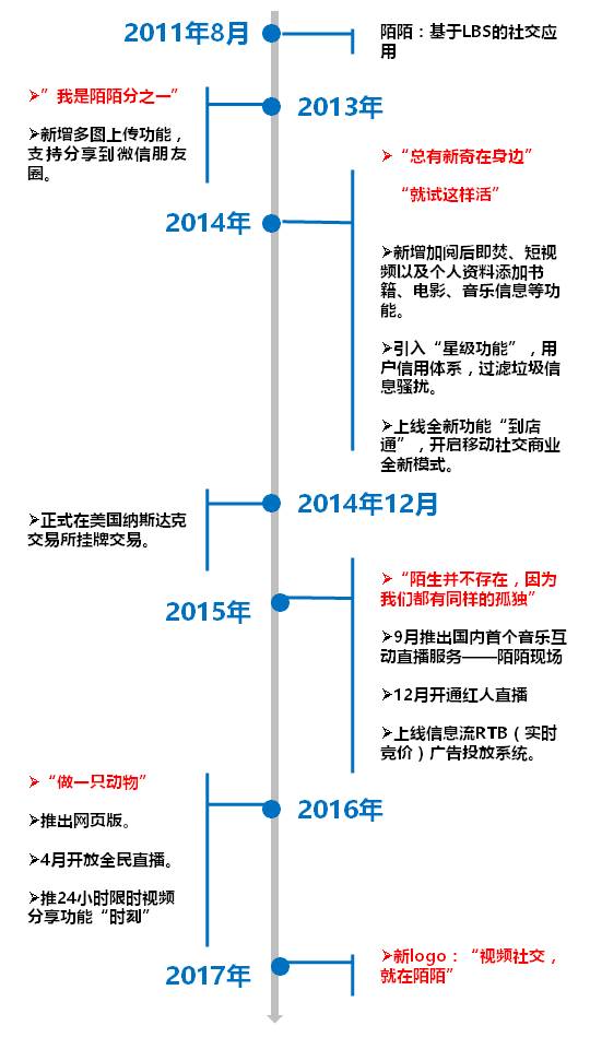 先来看一下自成立以来,陌陌每年的品牌主张和重要的产品升级: