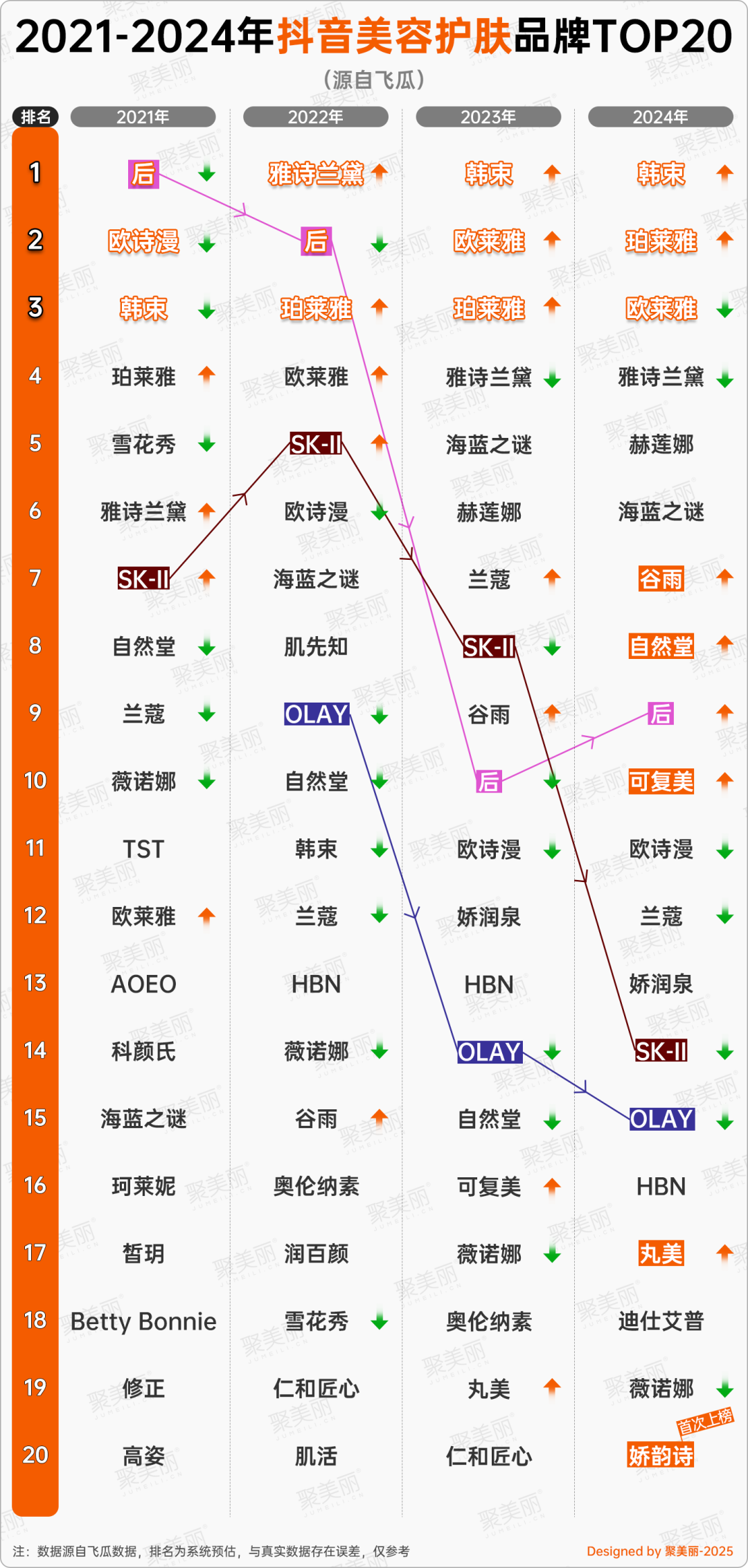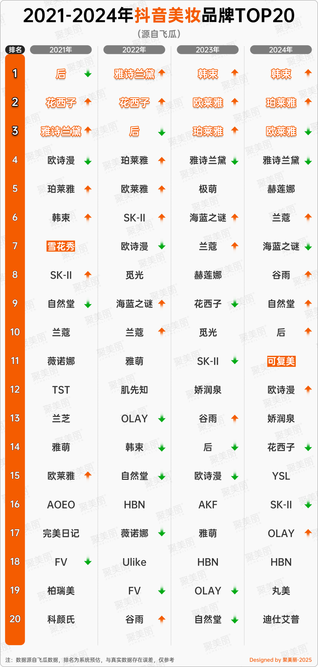 对比2021-2024年抖音美妆TOP20来看,品牌位次发生了蝶变: