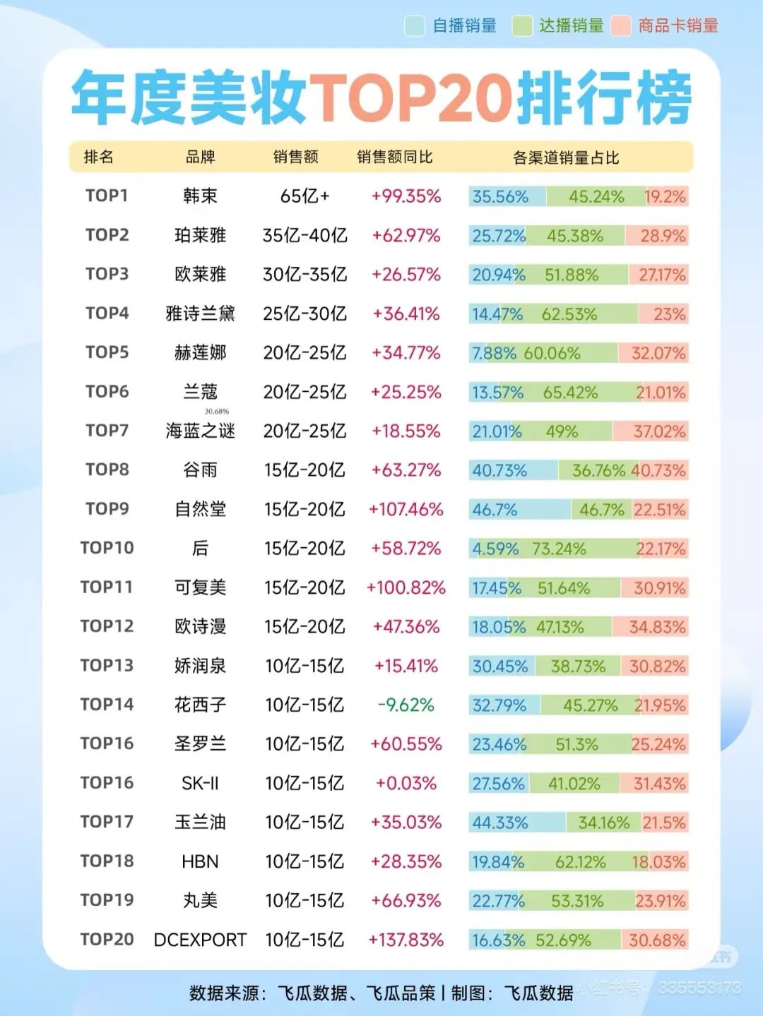 同时,头部国货品牌珀莱雅以(35-40亿销售额)超60%增速,甩开欧莱雅数亿元霸榜抖音美妆TOP2;丸美、可复美、欧诗漫有明显上升,尤其是可复美呈三位数增长,并首次上榜。