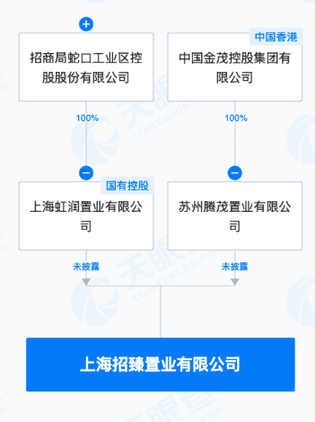 天眼查App显示,上海招臻置业有限公司近日成立,法定代表人为祁彦龙,注册资本30亿元,经营范围包括房地产开发经营、住宅室内装饰装修、房地产经纪、住房租赁等。股权全景穿透图显示,该公司由招商蛇口旗下上海虹润置业有限公司、中国金茂控股集团有限公司旗下苏州腾茂置业有限公司共同持股。