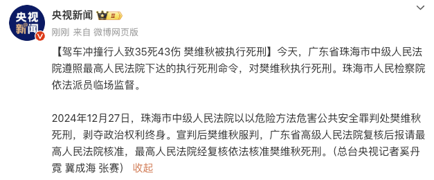 2024年12月27日,珠海市中级人民法院以以危险方法危害公共安全罪判处樊维秋死刑,剥夺政治权利终身。宣判后樊维秋服判,广东省高级人民法院复核后报请最高人民法院核准,最高人民法院经复核依法核准樊维秋死刑。(央视新闻)
