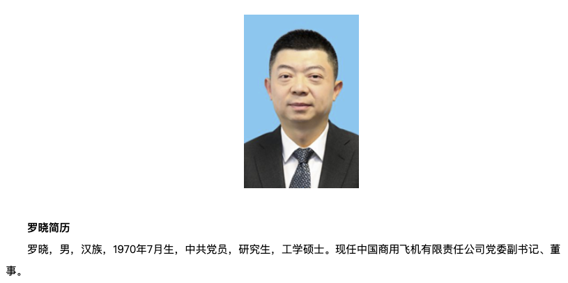 1月20日,中国商飞公司召开党委常委会会议,通报中央组织部关于公司领导任职的决定:罗晓同志任中国商用飞机有限责任公司党委副书记、董事;谭万庚同志不再担任中国商用飞机有限责任公司党委副书记、董事职务。相关职务任免按有关法律规定办理。