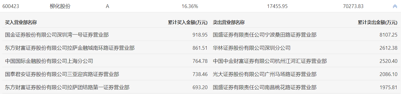 柳化股份今日跌停,龙虎榜数据显示,上榜营业部席位全天成交2.13亿元,占当日总成交金额比例为30.28%。其中,买入金额为3976.9万元,卖出金额为1.73亿元,合计净卖出1.33亿元。