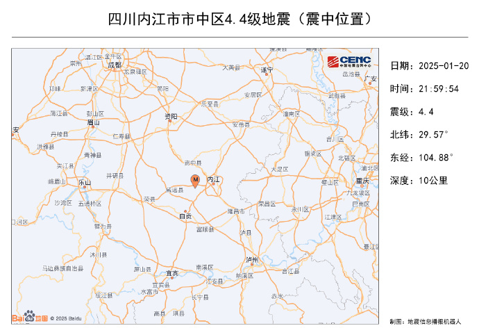 中国地震台网正式测定:01月20日21时59分在四川内江市市中区(北纬29.57度,东经104.88度)发生4.4级地震,震源深度10千米。此次震中距内江市区17公里,距资中县22公里,距成都市143公里。震中周边人口密集,地震有感范围较大,内江、自贡、资中等地均有震感反馈。
