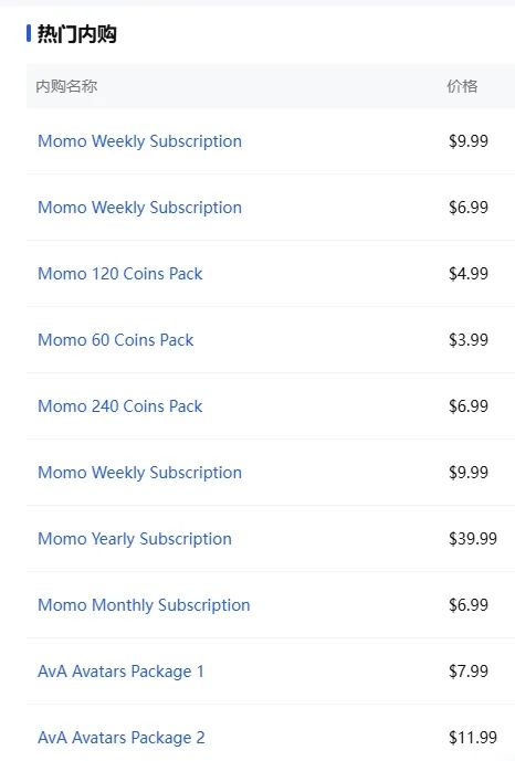 在Momo的内购项目中,除了传统的订阅和金币(应用内货币)外,还增加了套餐选项。最贵的内购为39.99美元的年度订阅,相对于9.99美元的周度订阅来说,长期订阅要划算很多。且其他项目均集中在10美元以内,整体价格较为适中。