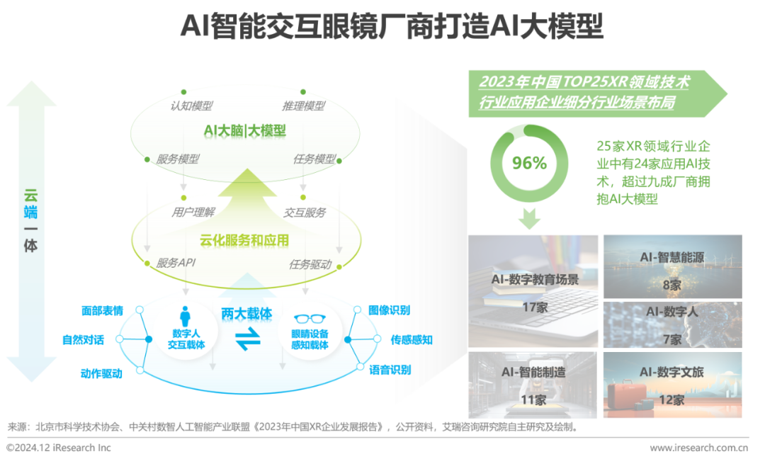 AI智能交互眼镜厂商注重迭代AI大模型技术,并深度整合到眼镜中,通过搭建一个“云端一体”的AI理解力及认知模型,在“云”上构架起一个以认知、推理、服务、任务等模型为基础的AI大脑,最终经由“端”实现用户需求的实时响应,情感大模型聚焦于虚拟人的拟人化的核心功能,打造交互更自然,陪伴更人性化,服务更精准的AI智能交互眼镜。2023年中国前25家XR领域技术行业企业中,有24家企业应用AI技术拓展行业场景,AI大模型技术开始逐渐与XR领域厂商融合。