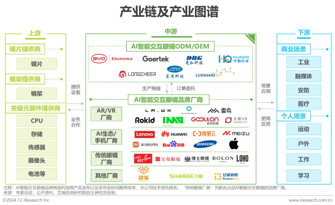 在中国AI智能交互眼镜的产业链中,上游由镜片、镜架和关键元器件的制造商构成,中游则涵盖了AI智能交互眼镜的ODM/OEM和品牌厂商,而下游则专注于商业和消费者场景的应用。自2024年以来,国内众多厂商相继宣布推出AI智能交互眼镜。在这一过程中,传统眼镜厂商加盟,AR厂商拓展产业矩阵,VR厂商积极转型入局,AI生态和手机厂商则不断深化其在AI技术和产品生态的布局。此外,脑机接口、移动电源等相关行业的厂商也陆续发布了新产品。整体而言,AI智能交互眼镜行业正展现出蓄势待发、蓬勃发展的活力。