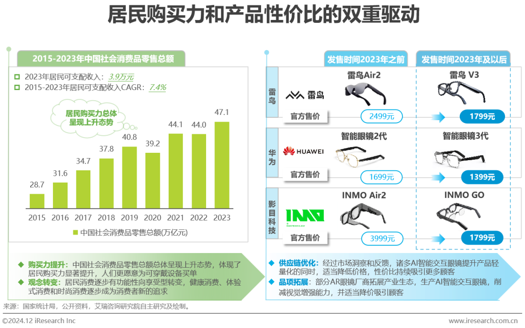 随着居民可支配收入的稳步增长,中国社会消费品零售总额呈现总体上升的态势。在经济波动期的影响下,健康消费、体验式消费和时尚消费成为消费者新的追求,居民消费逐步由功能性向享受型转变,随着AI智能交互眼镜等可穿戴设备开始大量涌入市场,消费者对个性化和高品质的产品追求得到了更多满足。目前各大厂商陆续推出的新款智能音频眼镜,产品定价更加亲民,预计能降低市场教育成本,且快速培养用户使用习惯,未来更容易被更广大消费者接受。