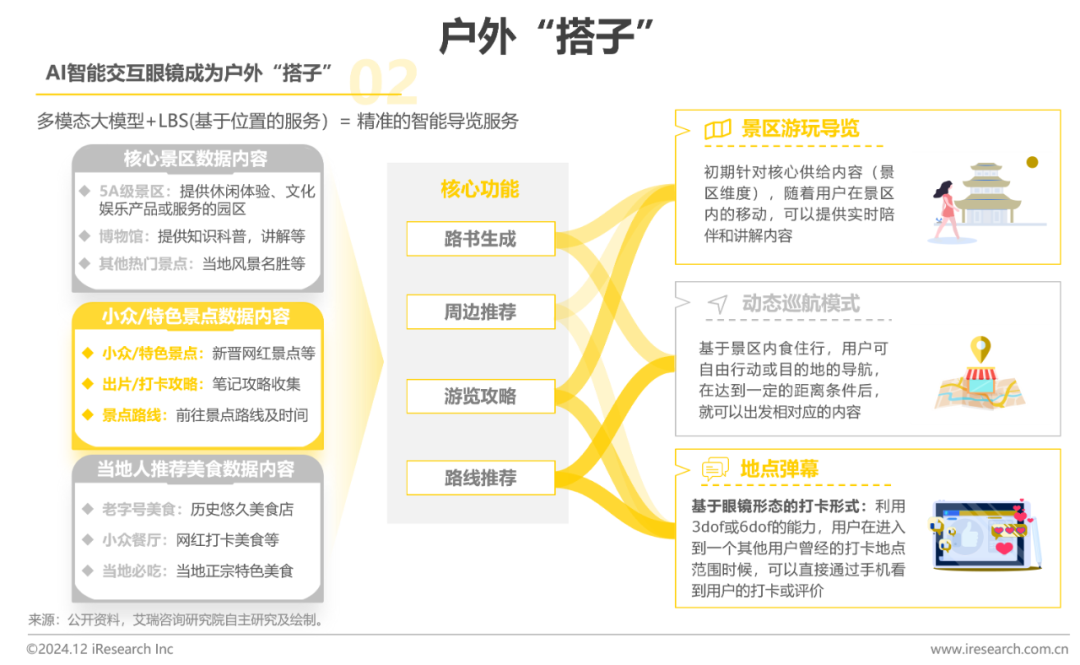Citywalk(城市中轻量级的步行活动)、露营、一日游等轻型旅游逐渐成为年轻人青睐的室外项目,AI智能交互眼镜结合庞大的景区数据,打造景区游玩语音导览、自动巡航系统、地点弹幕等多个服务,在多模态大模型的加持下:“指哪儿问哪儿”,自动生成路线、游记,形成一套精准的智能语音导览服务,成为用户万能贴心的户外“搭子”。