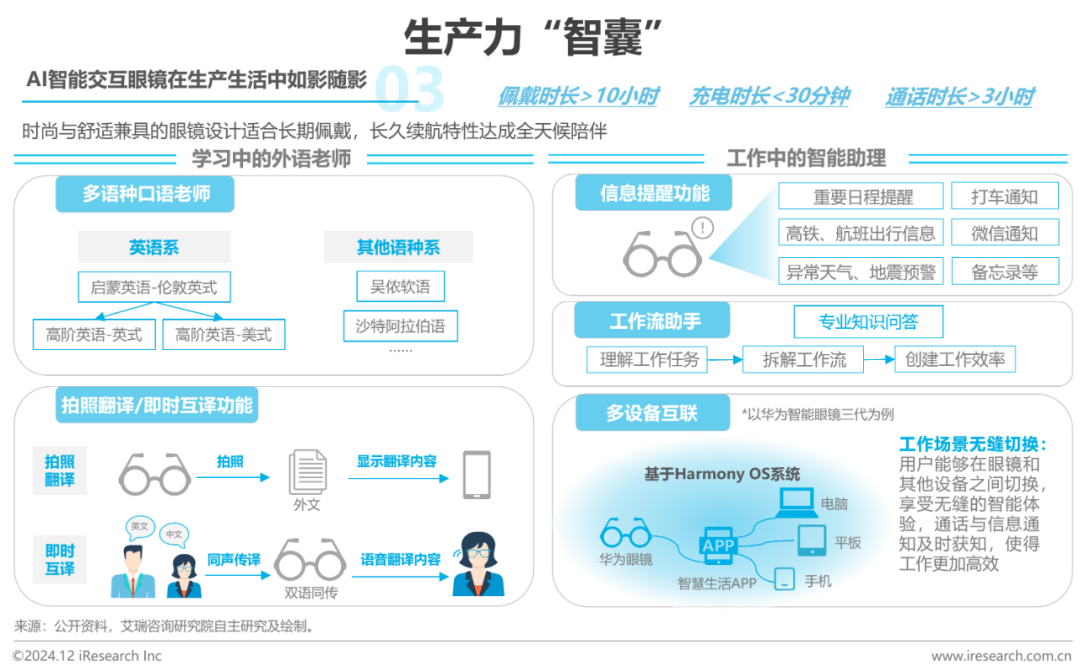 在学习场景中,AI智能交互眼镜将作为口语AI老师,凭借智能分析能力为用户提供了个性化的口语辅导,同时拍照翻译和同声传译功能成为用户外语运用的强力工具;在工作场景中,AI智能眼镜将作为AI顾问设置信息提醒,协助用户合理安排时间,提高工作效率,多设备无缝衔接,高效工作。AI智能交互眼镜将作为AI生活助理,在学习和工作中如影随影。