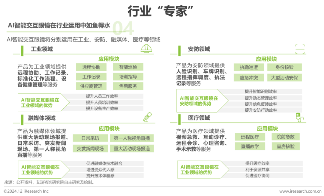 AI智能交互眼镜正在工业、安防、融媒体和医疗等多个领域探索应用潜力。在工业领域,它凭借远程协助、工作记录和设备健康管理等模块提升生产效率和标准化流程;安防领域则通过识别和指挥调度等服务,增强了动态管理效率和行动效率;融媒体领域增进了受众的代入感;医疗领域则通过视频急救和远程医疗等模块,提升了医疗服务效率和协同性。尽管这些应用尚未完全成熟,但AI智能交互眼镜的潜力无限,预示着未来技术与行业的深度融合,将开启一个全新的智能交互时代。