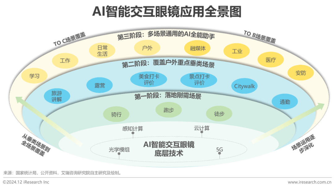 随着5G网络、云计算能力、感知计算以及光学模组技术等的持续革新与演进,AI智能交互眼镜场景应用或将持续性、渐进性地完善壮大。首先第一阶段,AI智能交互眼镜通过骑行、徒步等刚需垂类场景快速落地,第二阶段,覆盖户外重点用户场景,包括Citywalk(城市中轻量级的步行活动),通勤等,打磨各个垂直领域的多模态任务大模型,积累多场景的AI助手服务能力,第三阶段,AI智能交互眼镜将打通多设备终端,让AI助手围绕篇用户生活,提供全方位效率型刚需服务。因此AI智能交互眼镜应用场景发展路径从特定刚需垂类场景的精准适配,到户外多场景需求的全面覆盖,最终塑造为强大的生产力工具,为用户提供全方位的效率型刚需服务。