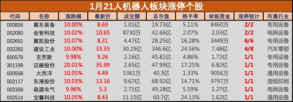 1月21日,机器人板块探底回升,迈赫股份(301199)、建设工业(002265)等涨停;凯尔达(688255)、长盛轴承(300718)、肇民科技(301000)涨超10%,斯菱股份(301550)、奥比中光(688322)、南方精工(002553)、拓普集团(601689)等涨幅靠前。